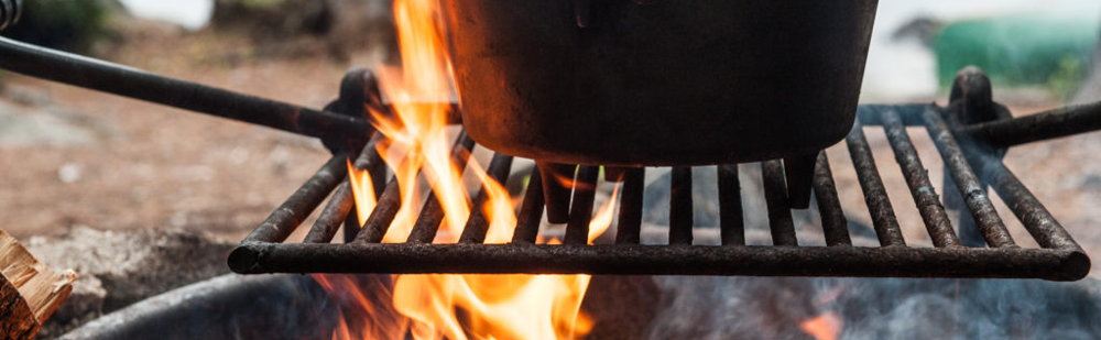 Een driepoot met alle bijhorende accessoires om op open vuur te koken.