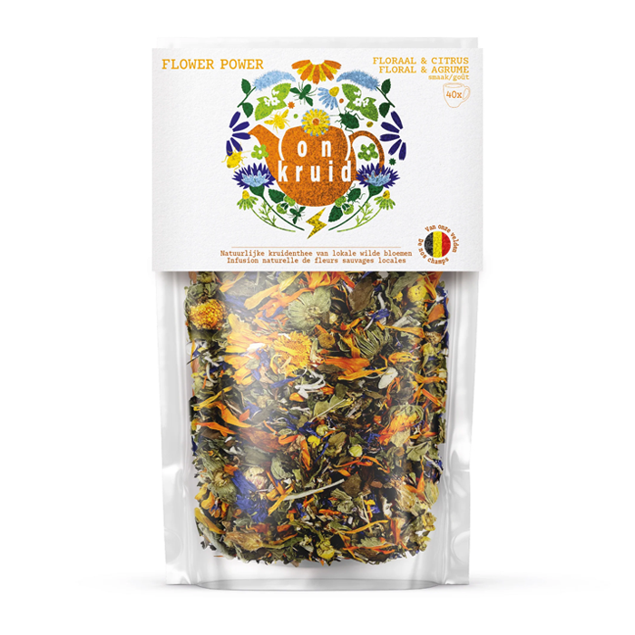Ingrediënten Flowerpower: akkergoudsbloem, korenbloem, citroenmelisse, echte kamille, groene munt, echte salie en lavendel.