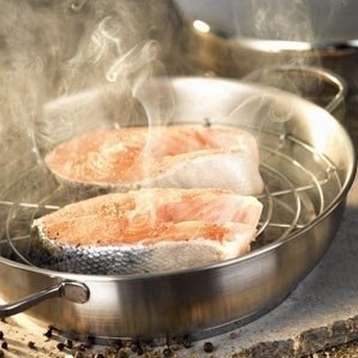 Met deze rookpan kun je heerlijke gerechten maken. Gerookte aubergine, paprika of een klassiek stukje gerookte vis.....mogelijkheden zijn eindeloos! Op 30 min tijd en 2 koffielepels rookmot heb je al een heerlijk resultaat. Diameter is 28cm, een mooi groot oppervlak waar je een mooie hoeveelheid in kan klaar maken.