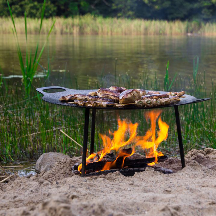 Deze compacte vuurschaal gebruik je als bakplaat. Je monteert die boven je kampvuur of plaatst die bovenop onze grote vuurschaal.