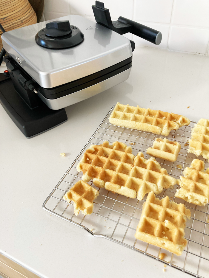 Als de wafel gebakken is haal je deze er uit met de wafelvork en leg je ze op de rooster om af te koelen.